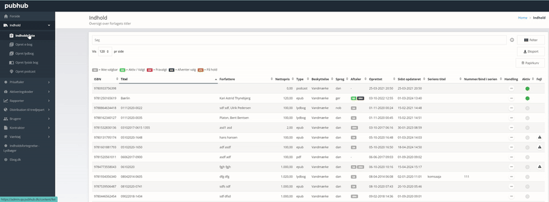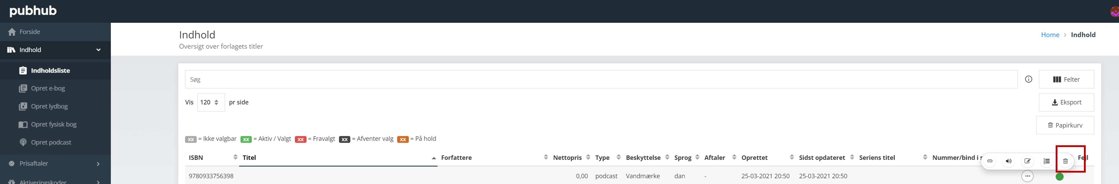 - I Pubhub, søg titlen frem under “Indholdslisten”. Klik på de tre prikker under menupunktet “Handling” og klik på ikonet skraldespand “Slet”. Herefter ryger titlen i skraldespanden og vil ikke længere være tilgængelig for salg og/eller udlån. Der sendes en takedown til de salgskanaler, der måtte have haft den og den fjernes fra din indholdsliste. Titlen kan gøres aktiv igen (hvis man f.eks. er kommet til at slette en forkert titel). Her søges den nu frem via “Papirkurv” og flyttes tilbage til indholdslisten igen.