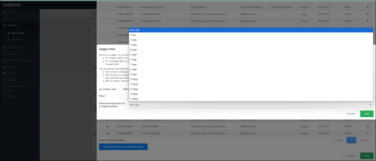 Denne metode kan kun bruges til at oprette eksklusive salgsperioder med styksalg forhandlere. På nuværende tidspunkt er det desværre ikke muligt at oprette en eksklusiv aftale med Bog & Ide via Pubhub.