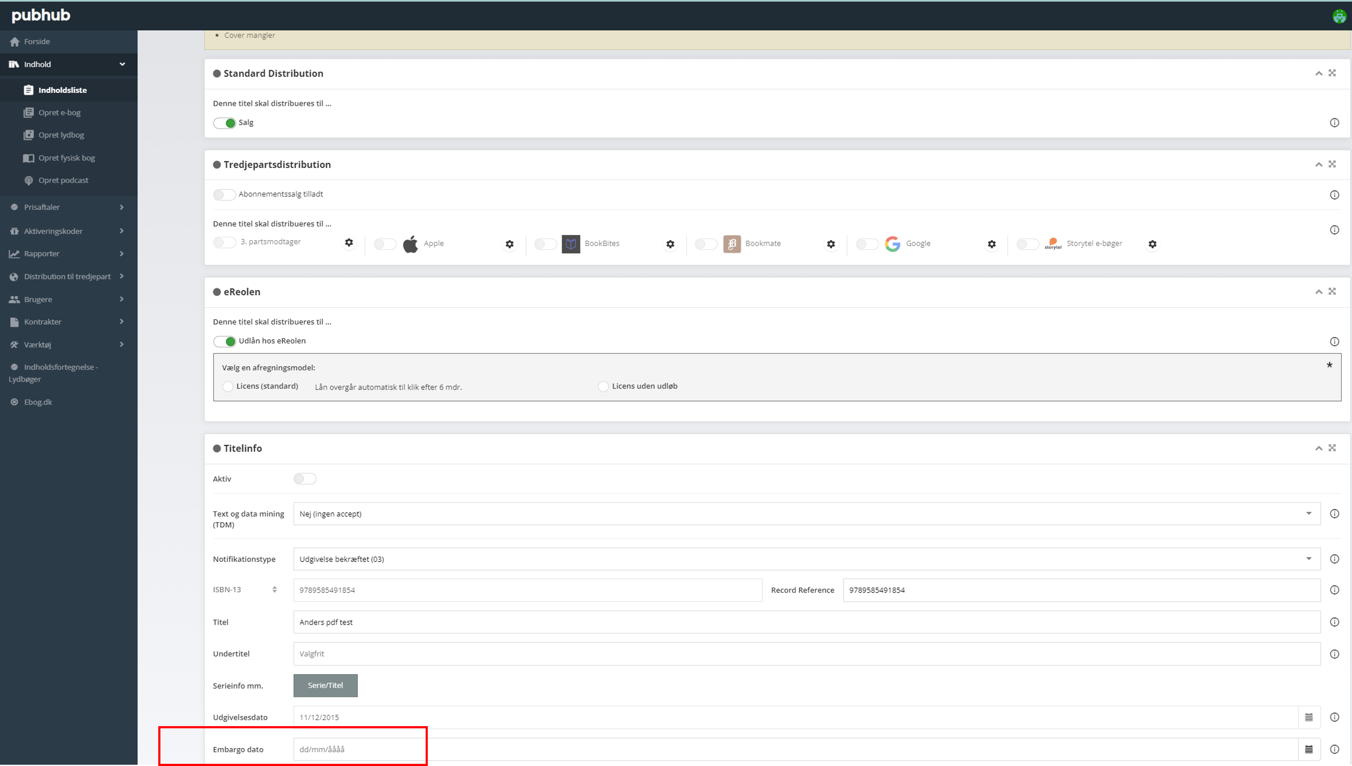 I Pubhub kan du på titel niveau indsætte en salgs embargo dato, hvis der er en hold back periode for styksalg. Denne mulighed findes ved at udvide datofeltet under "Udgivelsesdato".