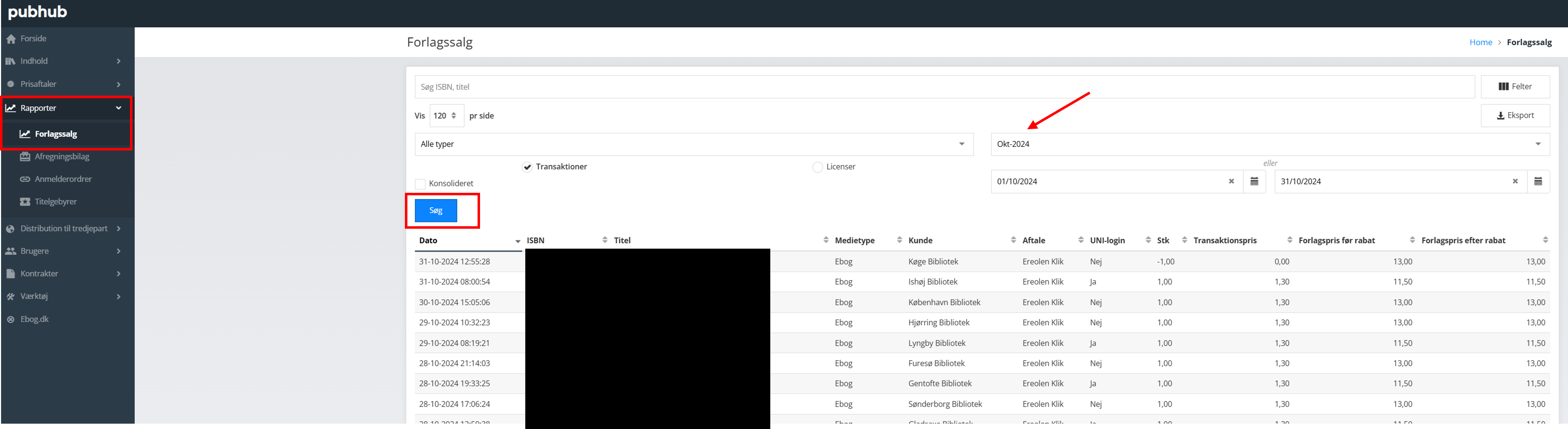 I Pubhub, under fanen "Rapporter" og derefter "Forlagssalg," kan du finde oplysninger om salgsantal fra styksalgsforhandlere, Bog & Idé Streaming (IR), samt antallet af udlån på biblioteker, hvis dine titler også distribueres til eReolen. Læs mere her hvordan du læser din forlags salgsrapport?