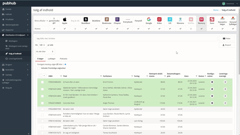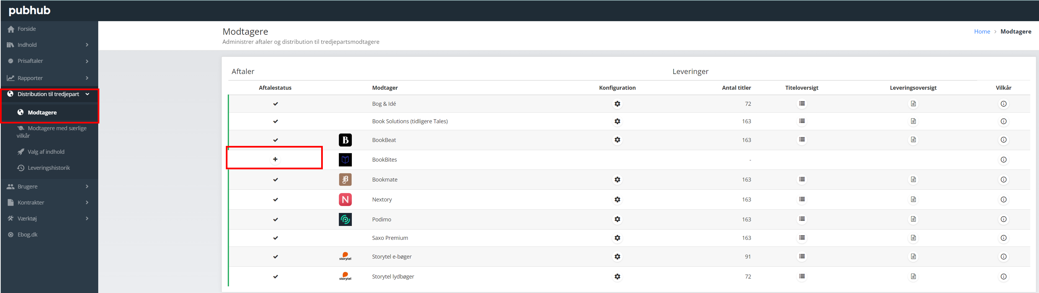 Når Publizon har aktiveret modtageren på din forlags konto, skal du logge ind i Pubhub og aktivere den nye modtager under “distribution til tredjepart” - “modtagere”.