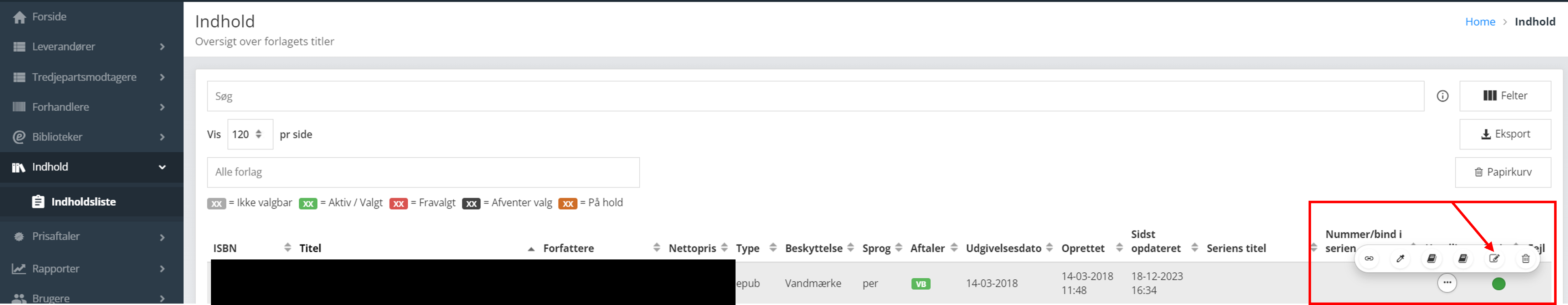 Log ind i Pubhub og find titlen frem fra din indholdsliste. Klik “Rediger” og opdater de oplysninger der måtte være relevante at opdatere. Hvis de tre prikker med redigeringsknappen ikke vises, kan du maksimere din skærm.